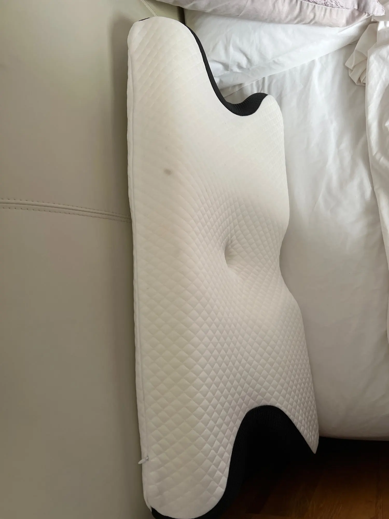 The pillow I received is different from the one shown in the offer photos. The one in the offer has a gently rising part supporting the neck. However, the one I received has a vertical part 11 cm high. I received a pillow that I would not have ordered if I knew it had such a high and uncomfortable neck support part while sleeping.